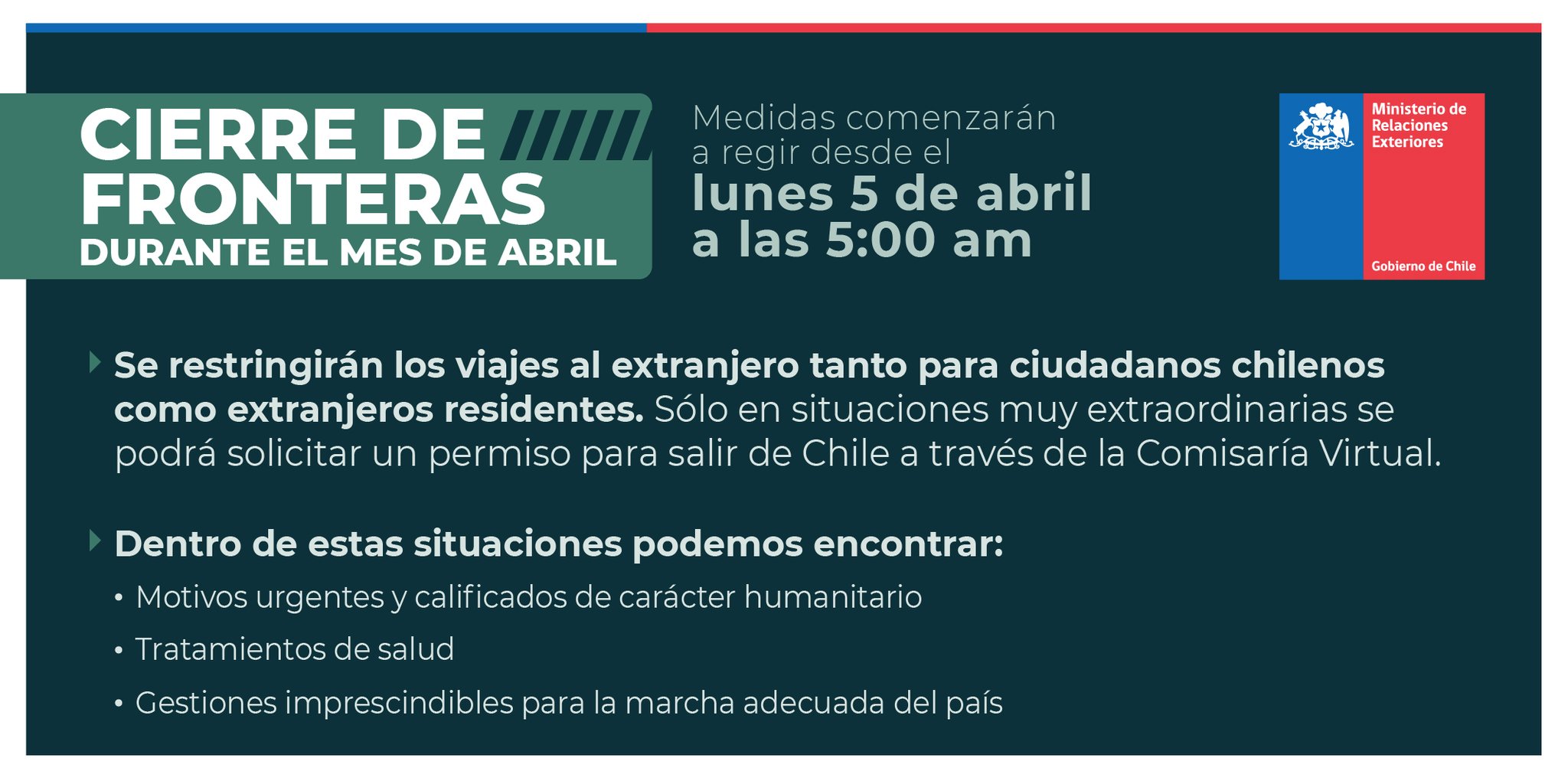 Santiago (sputnik) — la restricción de cierre de fronteras que comenzó a regir en abril de este año en chile se extenderá hasta el domingo 25 de julio debido a. La medida de restricción de viajes aplica tanto para ciudadanos chilenos, como extranjeros residentes en nuestro país. En el caso de que uno de ellos tenga examen positivo al coronavirus, ingresará a una residencia sanitaria y la empresa transportista deberá hacerse cargo de la operación de la carga y del camión. Gobierno cierra fronteras de chile por todo el mes de abril. Sólo se podrán realizar viajes al extranjero en caso de situación extraordinaria y con un permiso de la comisaría virtual si: